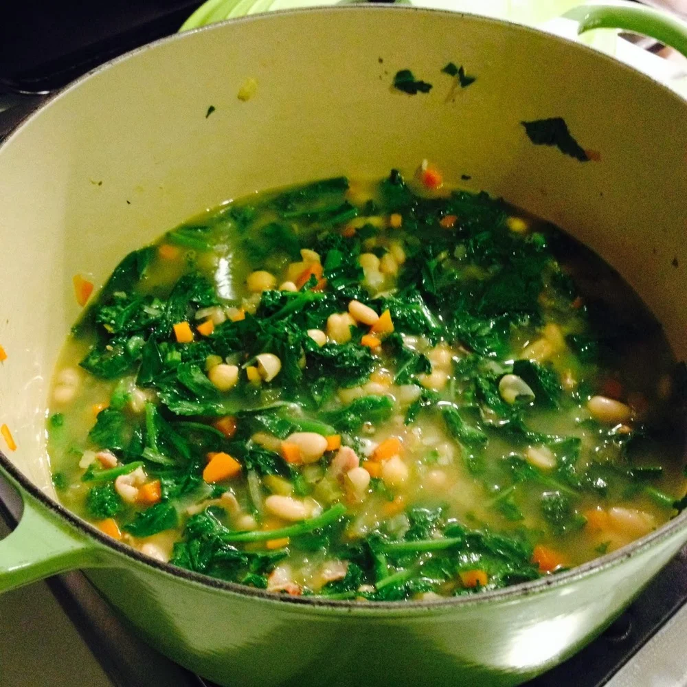 It's veggie/healthy/detox week here at the Casa Moshan. We have indulged in rich food and drink for too long and need a break. So this weekend I got out my healthy cookbooks: Alice Waters' The Art of Simple Food II. And last night, as the temperatures outside dropped to 5 degrees, I made an adapted version of her White Bean and Broccoli Rabe Soup (recipe below).